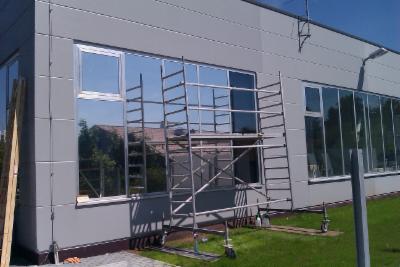 Vorführraum und Werkstatt. Außen verspiegelt, im Innenraum kühl.